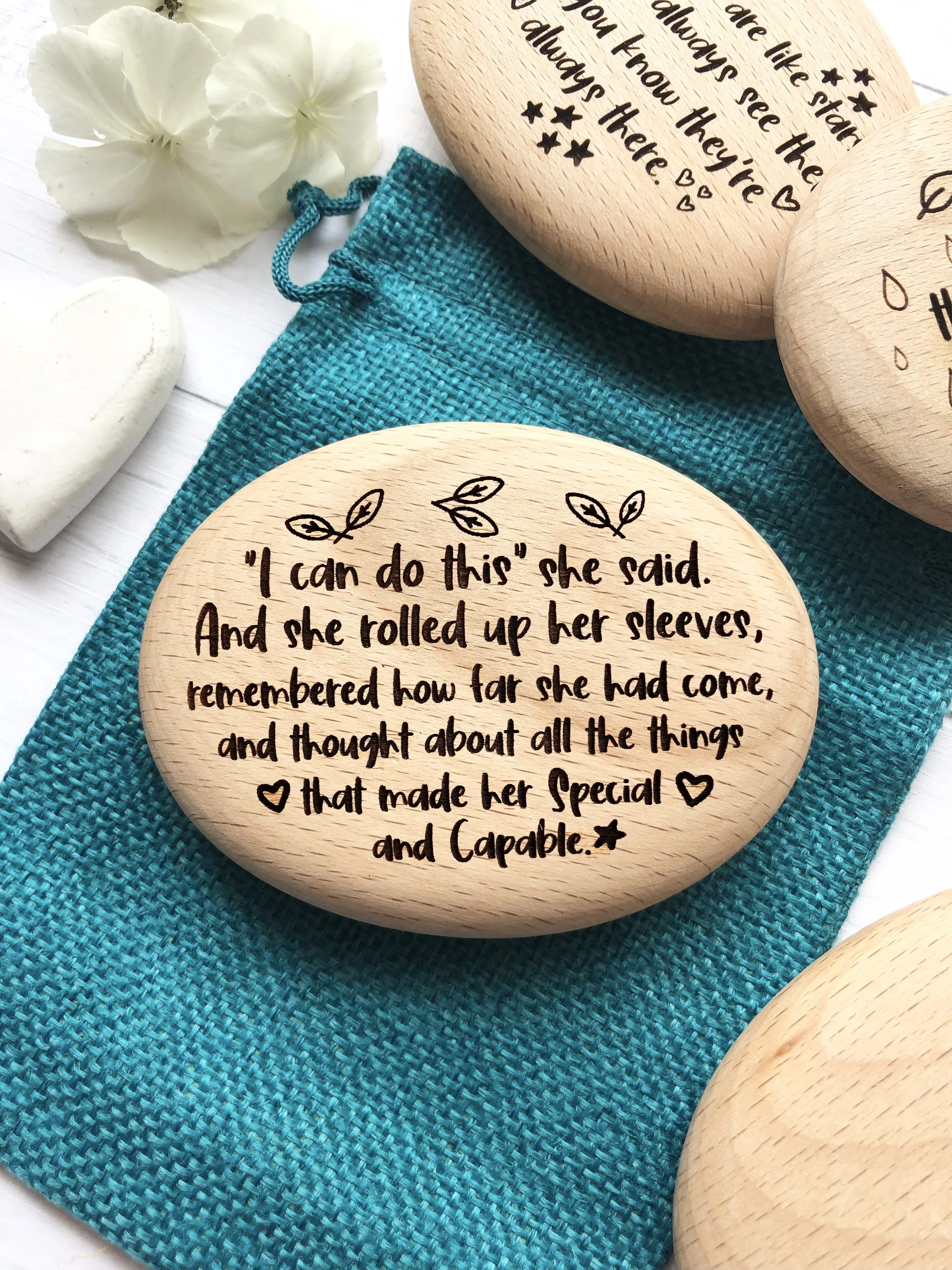 An original verse from And You Can Quote Me, engraved onto an FSC Certified Wooden Pebble.